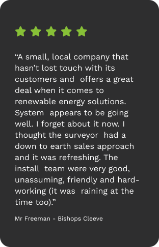 “Forever Green set up our system to take advantage of off peak tariffs. During the day, our battery stores solar generated power and if we need an occasional top up, it stores energy from off peak hours to use when everyone is at home.” Mr Smith, Tewkesbury